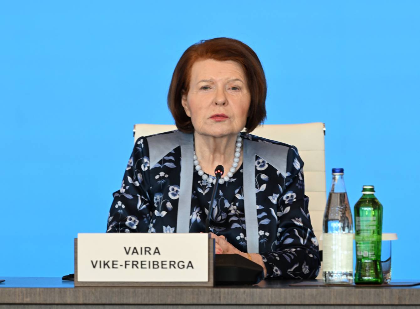 Daha sonra çıxış edən Latviyanın sabiq Prezidenti, Nizami Gəncəvi Beynəlxalq Mərkəzinin həmsədri Vayra Vike-Freyberqa Forumun dünyanın qlobal çağırışları ilə bağlı fikir mübadiləsi aparılmasına geniş imkan yaratdığını qeyd edərək dedi: “İstərdim, mən də Nizami Gəncəvi Beynəlxalq Mərkəzinin Qəyyumlar Şurasını salamlama fikirlərinə qatılım və Sizin burada olmağınızdan məmnunluğumu ifadə edim. Eyni zamanda, biz Azərbaycan Respublikasına təşəkkürümüzü bildiririk ki, artıq 13-cü dəfədir bu Foruma ev sahibliyi edir və Prezident İlham Əliyev də çıxışında bu tədbirin əhəmiyyətini qeyd etdi. Xatırlayıram ki, bir çox il əvvəl biz bu təşəbbüsə başlayanda ideya ilə Prezident qarşısında çıxış etdik və Prezident Nizami Gəncəvinin doğum günü ilə əlaqədar tədbirə dəvət etdi və hər il bu tədbirlərin keçirilməsinin əhəmiyyətini qeyd etdi, dedi ki, Azərbaycan bu tədbirə ev sahibliyi etməlidir. Cənab Prezident bizim o vaxt keçirdiyimiz tədbirdən daha böyük tədbirlərin Azərbaycanda keçirilməsinin təşəbbüsünü irəli sürdü və hazırda bu gün miqyas doğrudan da böyükdür”.